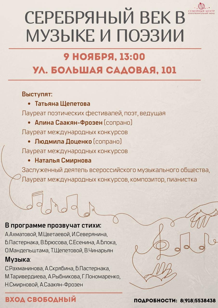 Гостей ждут стихи Ахматовой, Цветаевой, Блока, Пастернака и других поэтов Серебряного века, а также музыкальные произведения Рахманинова, Скрябина, Таривердиевой, Пономаренко и современных композиторов.